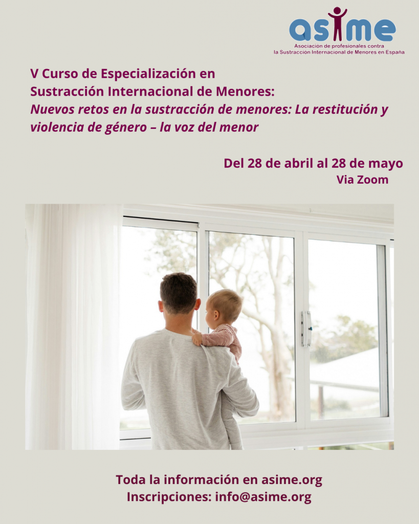 Del 28 de abril al 28 de mayo ASIME celebrará la quinta edición de su curso de especialización, esta vez bajo el nombre de «Nuevos retos en la sustracción de menores:La restitución y violencia de género – la voz del menor».