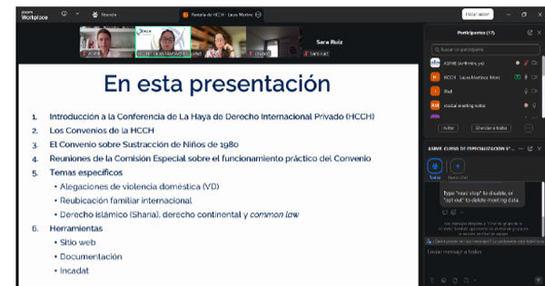 Durante esta primera sesión, la ponente realizó una introducción al papel y funcionamiento de la Conferencia de La Haya, abordando posteriormente los principales instrumentos internacionales aplicables en materia de sustracción internacional de menores. En especial, profundizó en el Convenio de La Haya sobre los Aspectos Civiles de la Sustracción Internacional de Menores de 1980, pieza clave en la protección internacional de la infancia frente a los traslados y retenciones ilícitas.